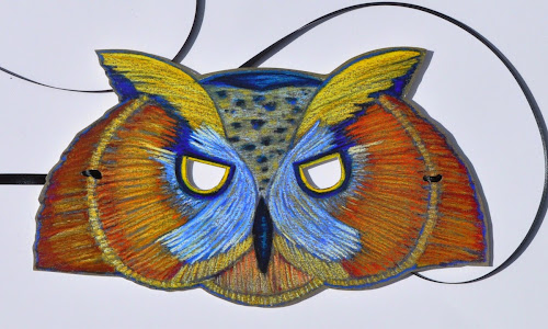 Now that summer is coming to a close (sigh), it seems okay to post a new owl Halloween mask. The photo includes the pastel original, in the background, and the print.